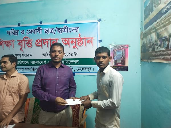 A scholarship distribution ceremony was held under the initiative of Subah Samajik Unnayan Sangstha, funded by the Bangladesh NGO Foundation, to support underprivileged and meritorious students in continuing their education.