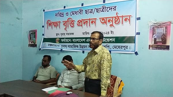 A scholarship distribution ceremony was held under the initiative of Subah Samajik Unnayan Sangstha, funded by the Bangladesh NGO Foundation, to support underprivileged and meritorious students in continuing their education.