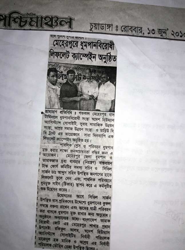 An anti-smoking leaflet campaign was recently held at the Meherpur Bus Terminal, aiming to raise awareness about the dangers of smoking and to promote a smoke-free public transport environment.