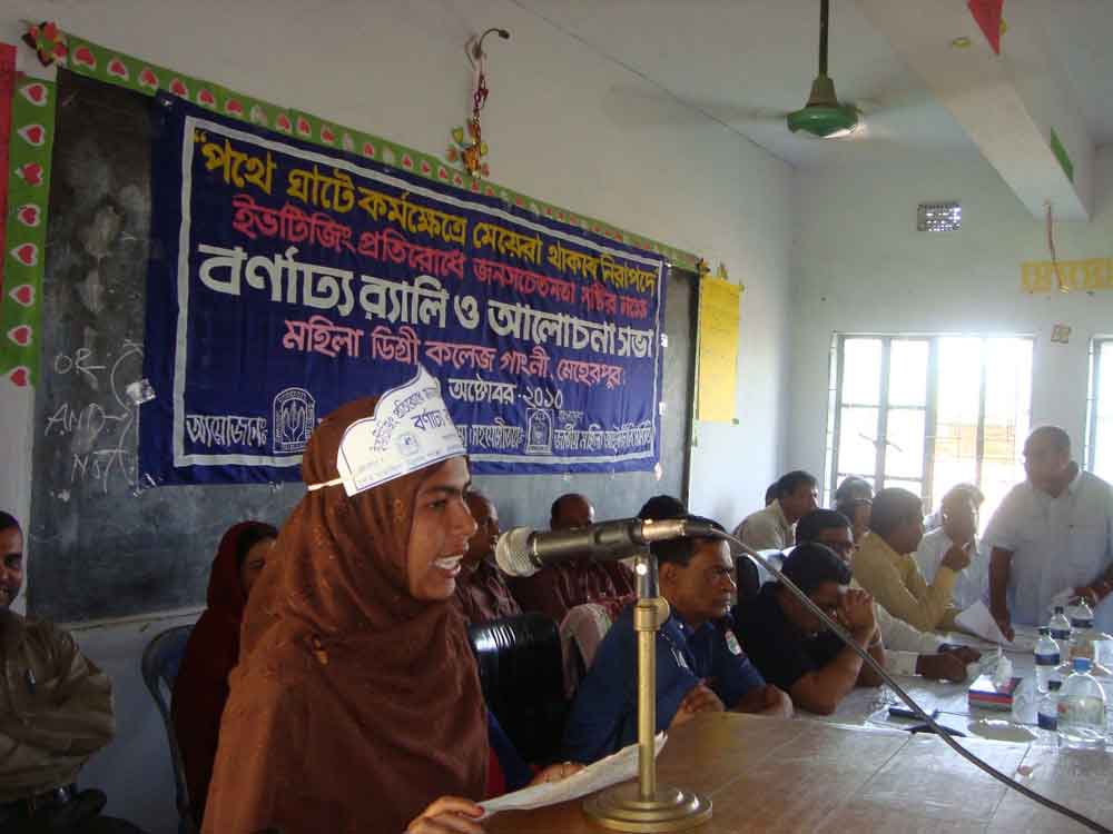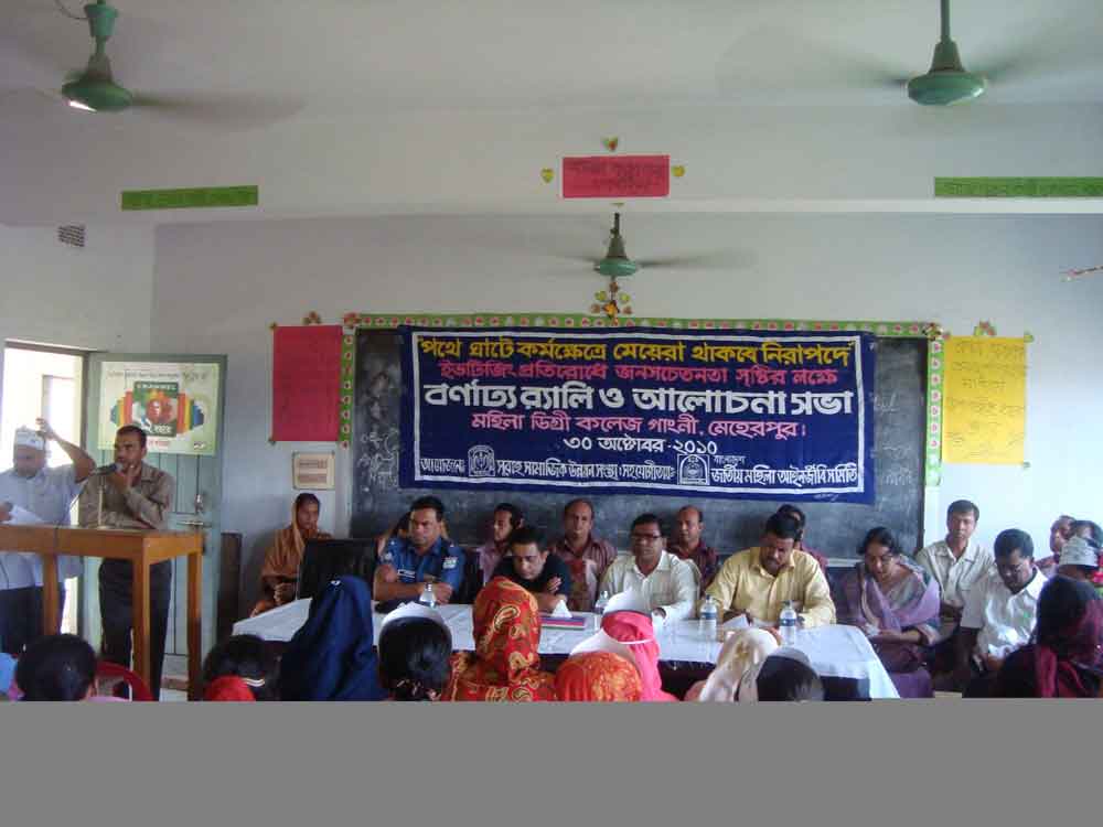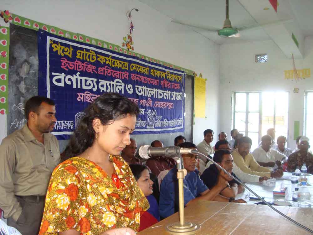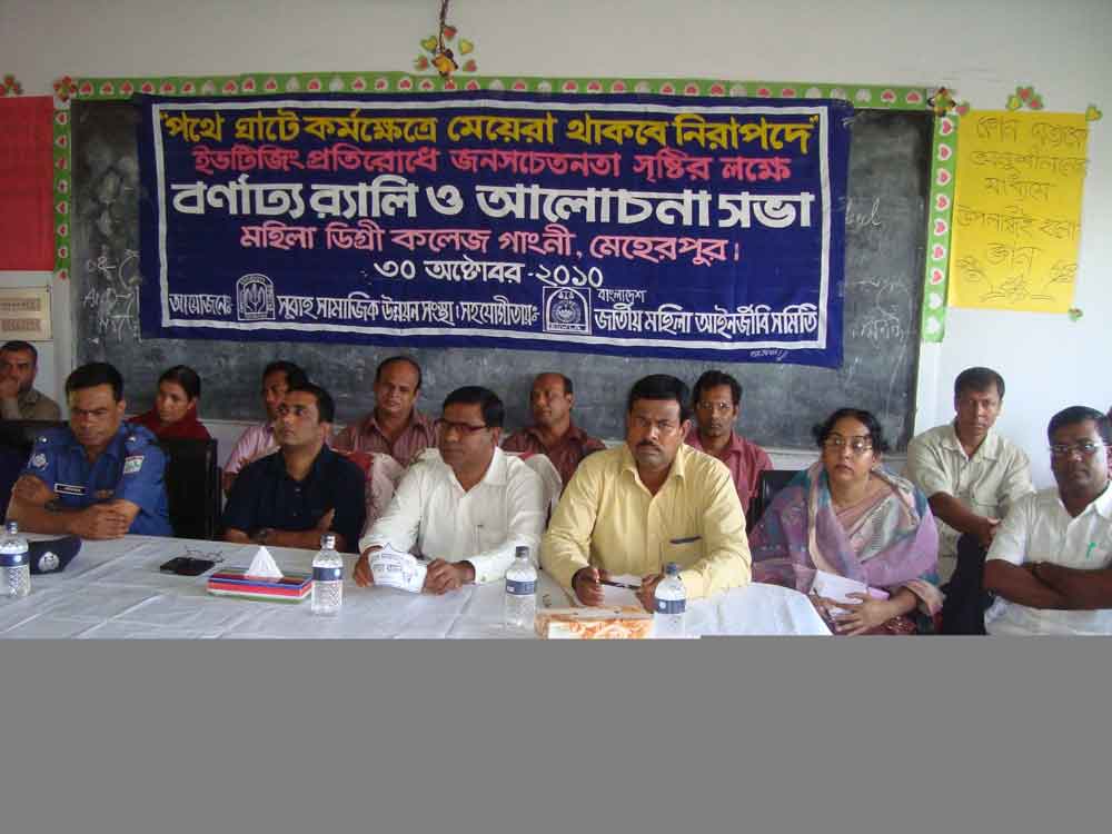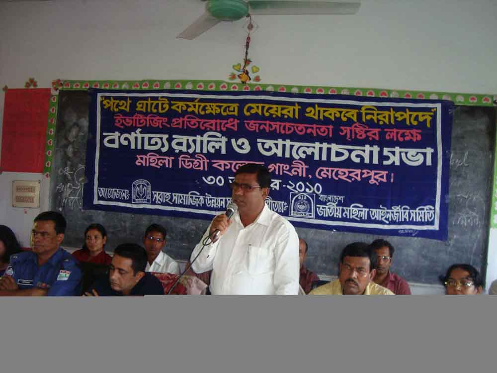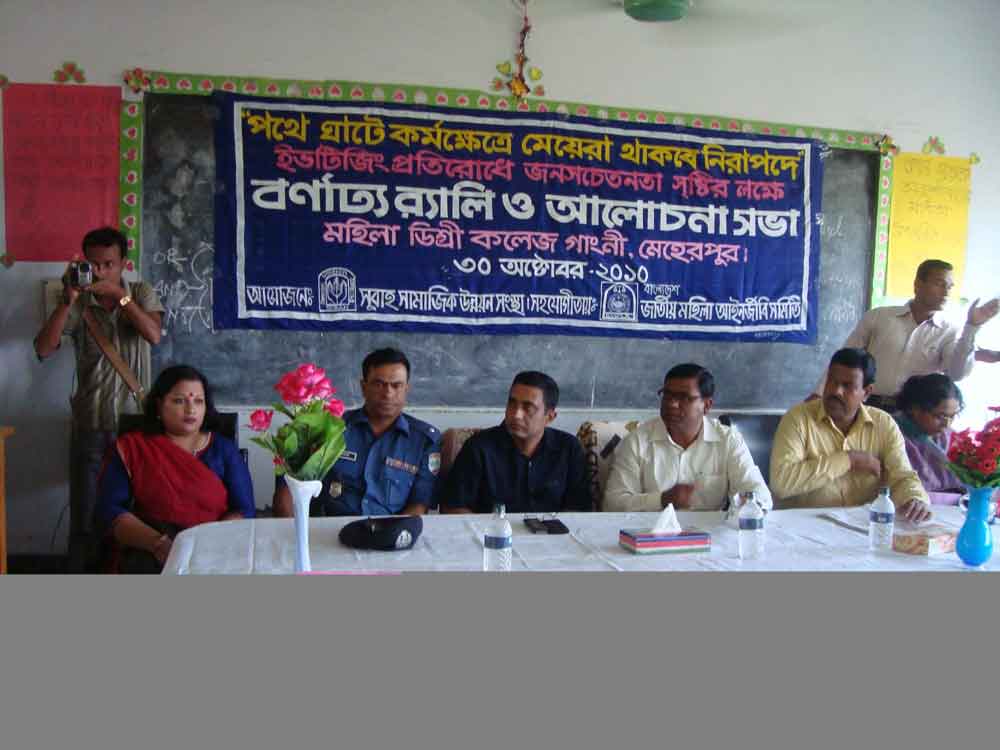 On October 30, 2010, an awareness rally and discussion meeting was held in Gangni Upazila to prevent eve-teasing, in collaboration with Subah Samajik Unnayan Sangstha. The main goal of the event was to raise public awareness about the negative impacts of eve-teasing and to promote effective measures to prevent such offenses in society.