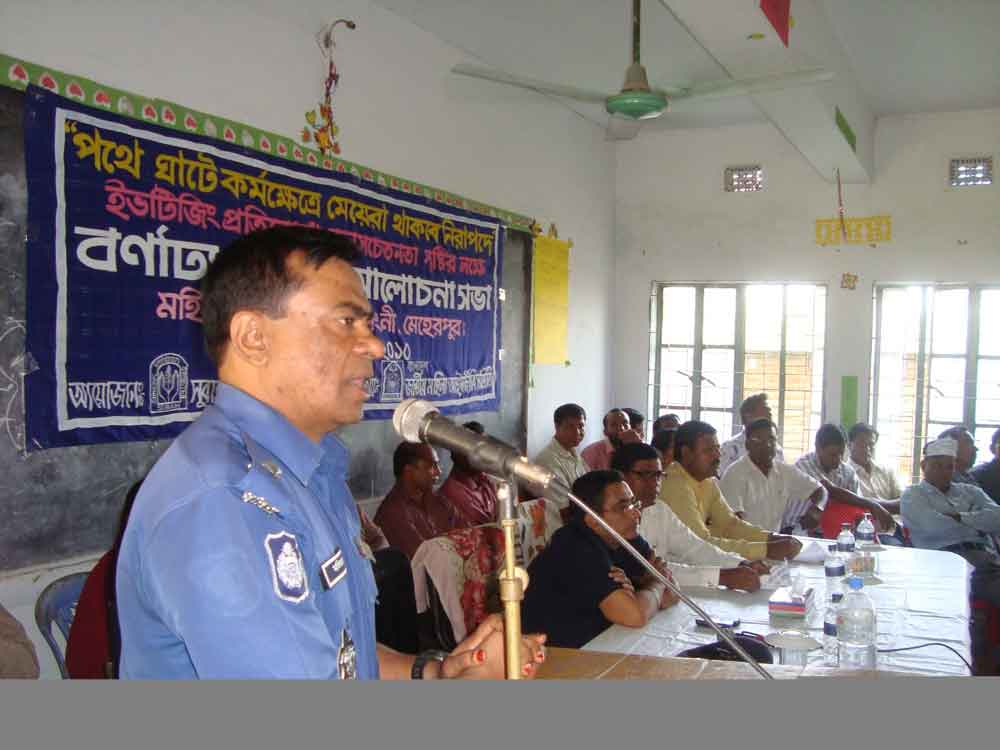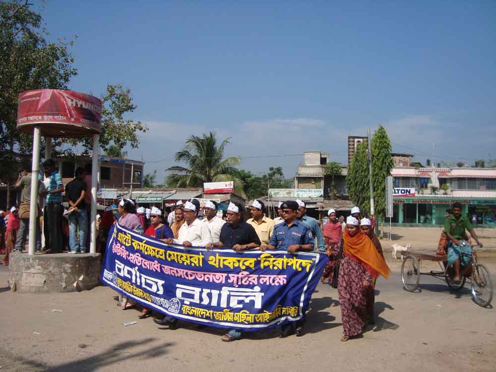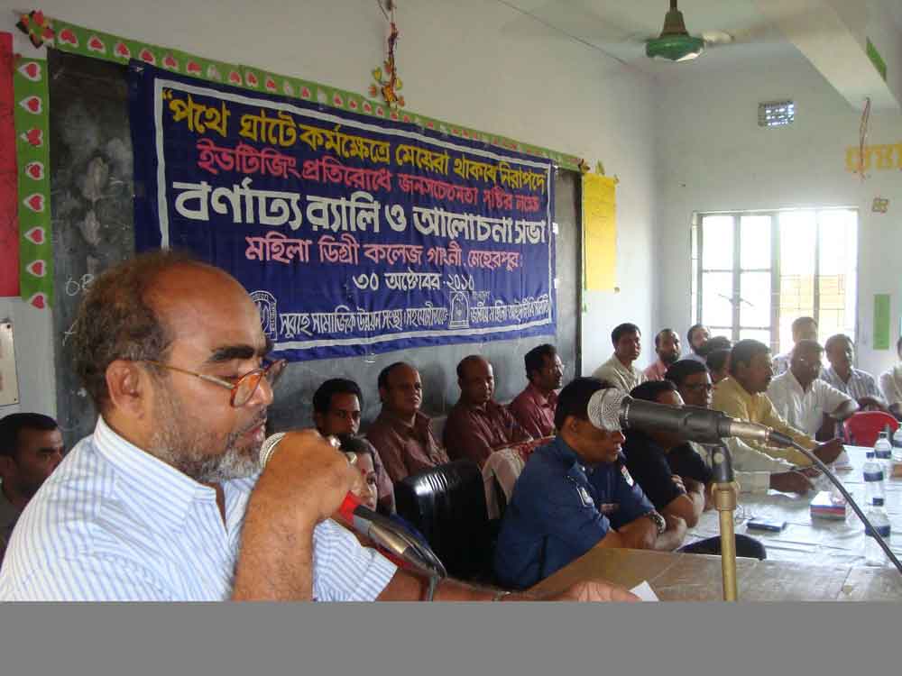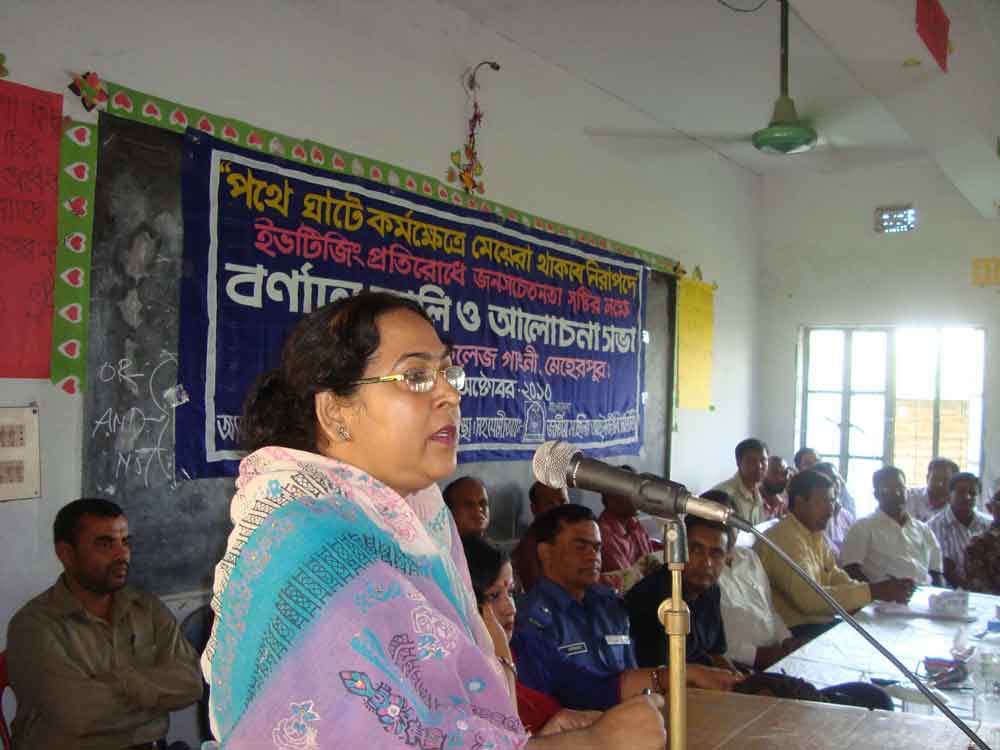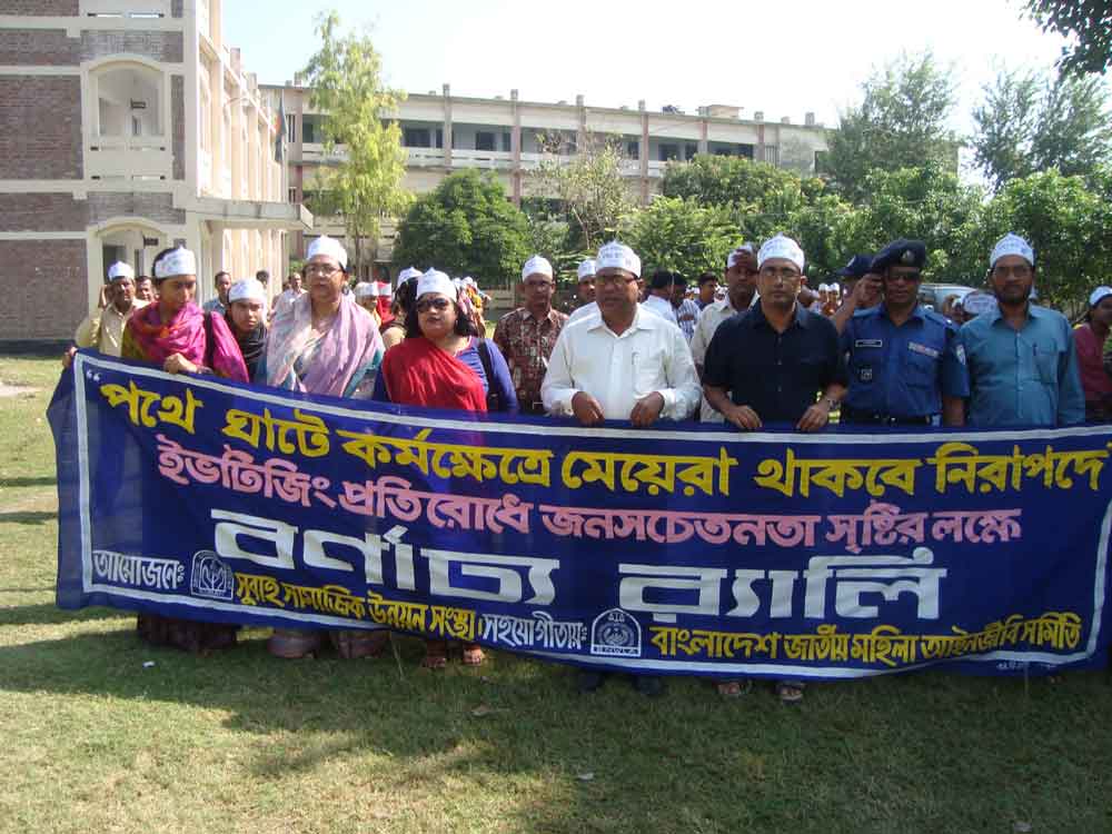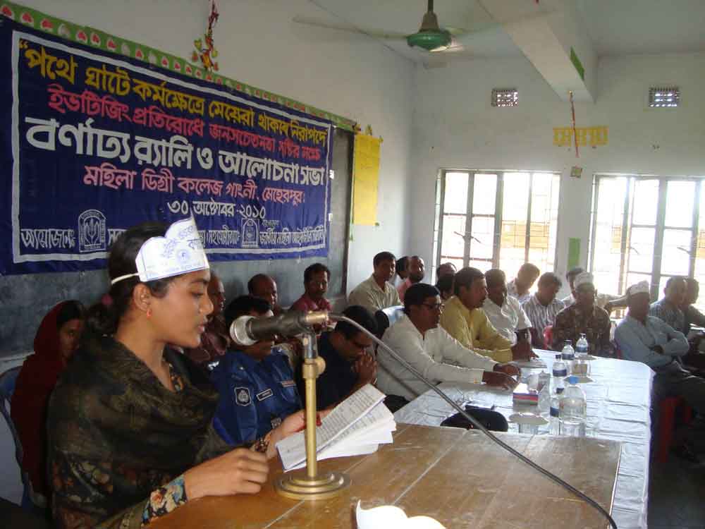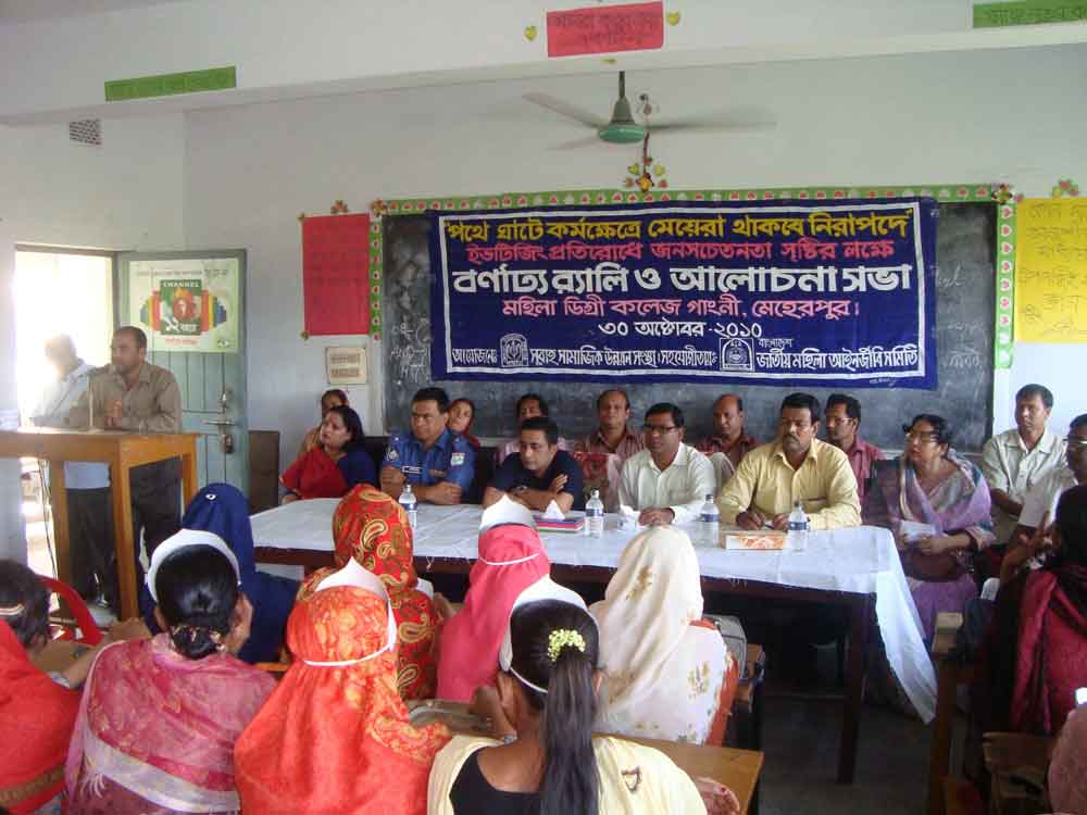 On October 30, 2010, an awareness rally and discussion meeting was held in Gangni Upazila to prevent eve-teasing, in collaboration with Subah Samajik Unnayan Sangstha. The main goal of the event was to raise public awareness about the negative impacts of eve-teasing and to promote effective measures to prevent such offenses in society.