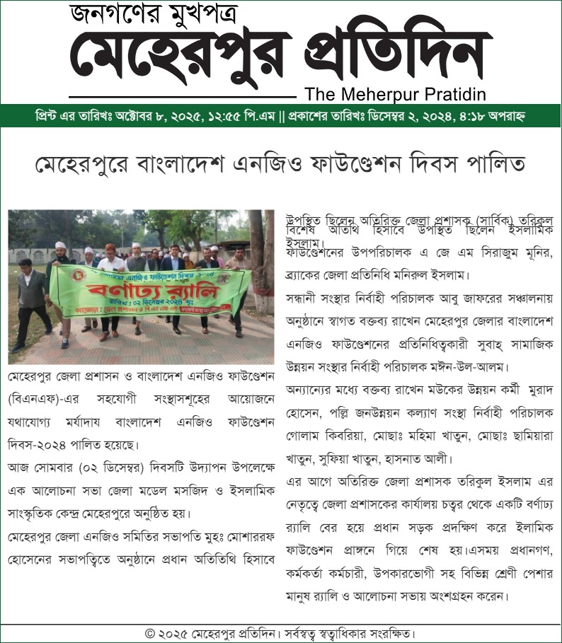 The Bangladesh NGO Foundation Day 2024 was celebrated in Meherpur with due dignity and enthusiasm. The event was organized by the Meherpur District Administration in association with the Bangladesh NGO Foundation (BNF) and its partner organizations.
