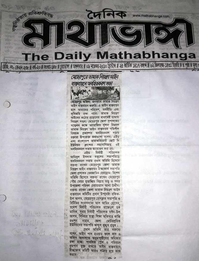 A discussion meeting on the implementation of the Smoking and Tobacco Products Usage (Control) Act was held in Meherpur, organized by the District Administration in collaboration with the Health Department and supported by Subah Samajik Unnayan Sangstha (SUBAH) and YPSA (Young Power in Social Action).