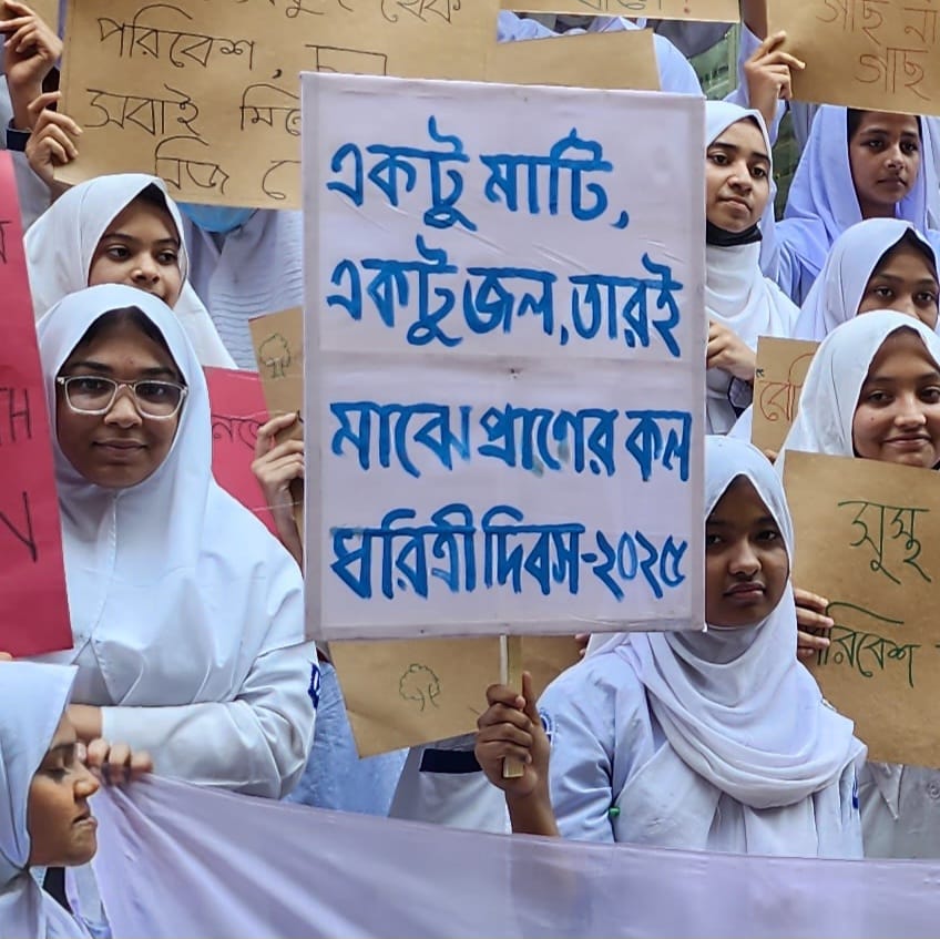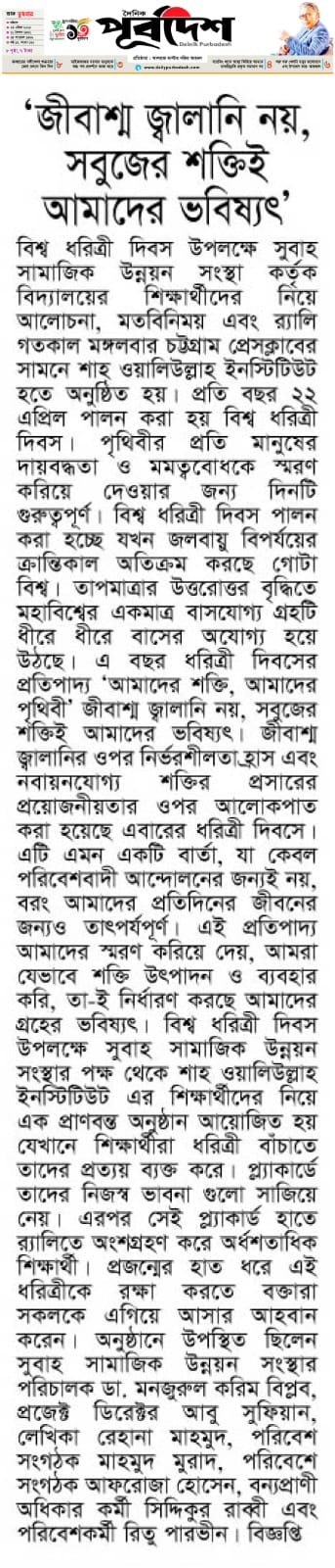 Subah Samajik Unnayan Sangstha observed Earth Day on Tuesday with a student rally, discussion, and awareness campaign held in front of the Chattogram Press Club. The event began from Shah Waliullah Institute and focused on this year’s Earth Day theme: “Our Planet, Our Power – Say No to Fossil Fuels, Embrace Renewable Energy.”