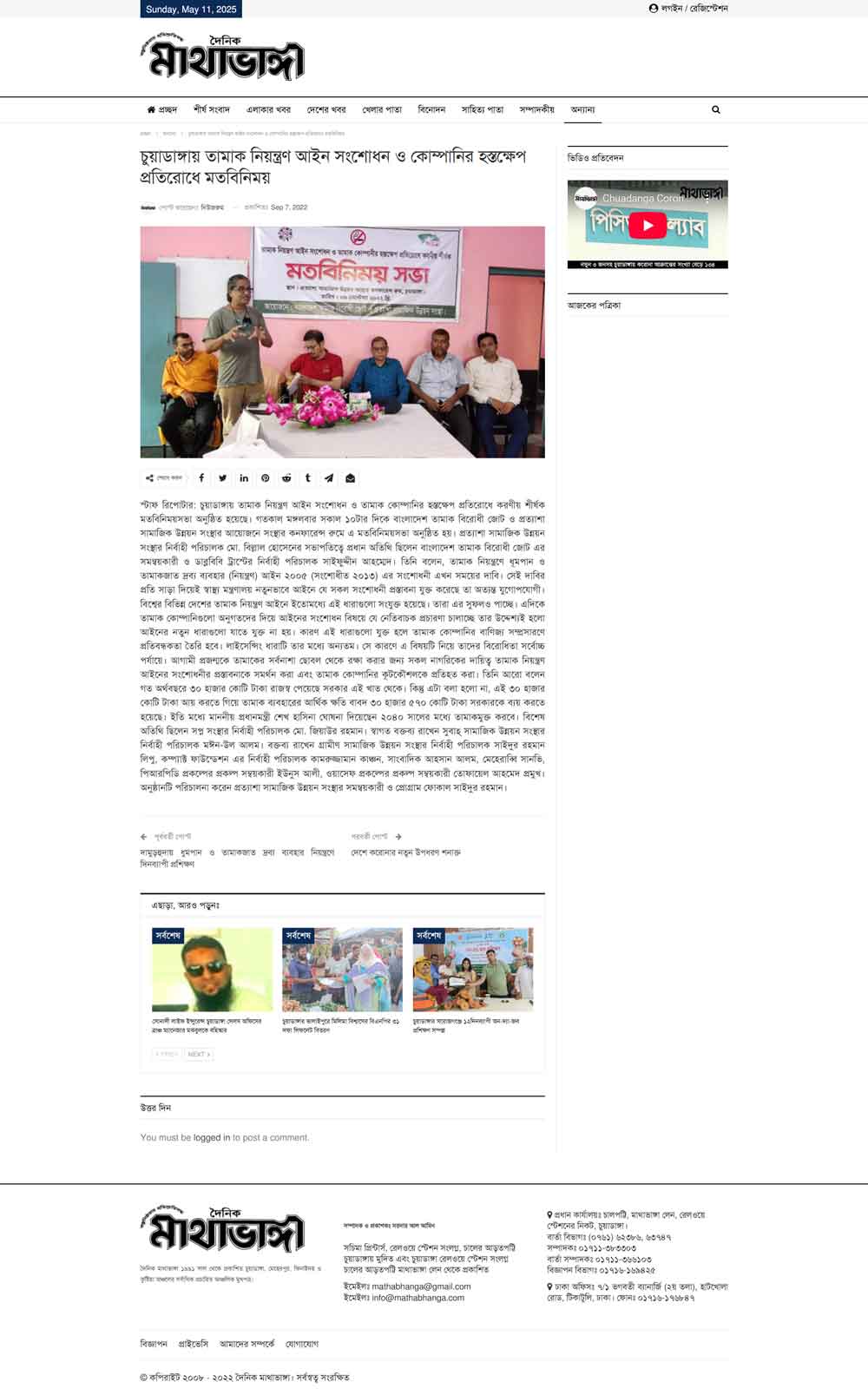 Dainik Mathabhanga, September 7, 2022, An exchange meeting titled “Amendment of the Tobacco Control Law and Preventing Industry Interference” was held on Tuesday morning in Chuadanga. The event was jointly organized by the Bangladesh Anti-Tobacco Alliance and Protyasha Samajik Unnayan Sangstha, and took place at the organization’s conference room.