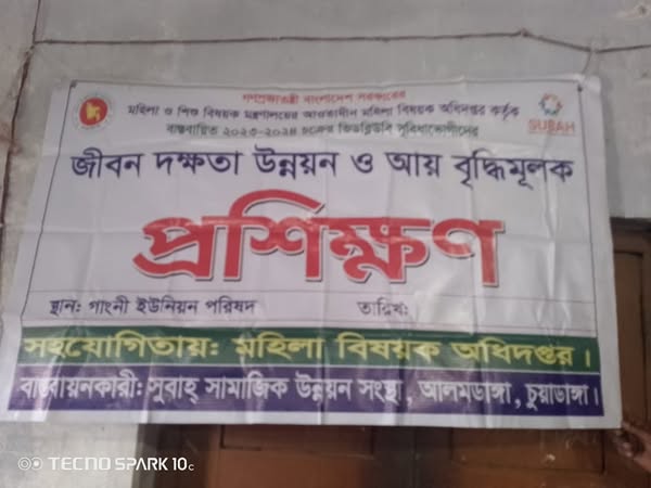 A day-long income-generating training and rice distribution program was successfully organized for VWB (Vulnerable Women Benefit) beneficiaries at Gangni Union Parishad, Alamdanga Upazila. The event was held under the supervision of the Department of Women Affairs (Ministry of Women and Children Affairs) and implemented by Subah Samajik Unnayan Sangstha.