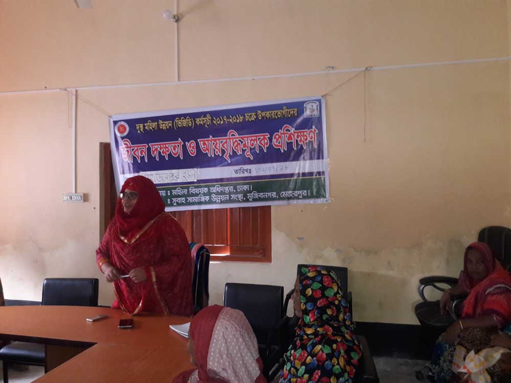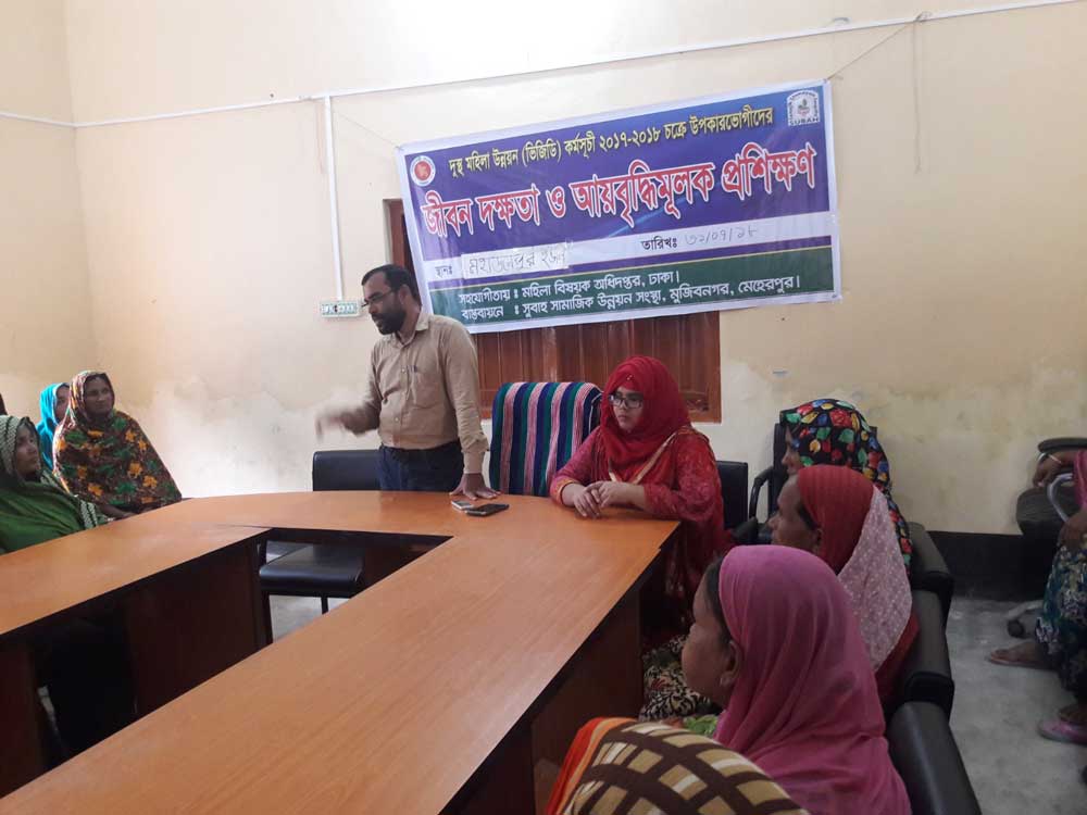 An income-generating training program is currently being conducted for the Vulnerable Group Development (VGD) beneficiaries of the 2017–2028 cycle at the Mohajonpur Union Parishad under Mujibnagar Upazila. The program is being implemented by Subah Samajik Unnayan Sangstha, with support from the Department of Women Affairs.
