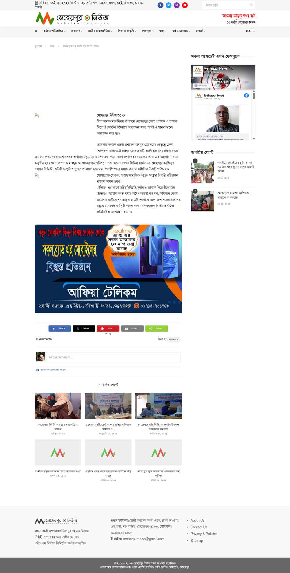 Meherpur News, May 31, 2015, To mark World No Tobacco Day 2015, the Meherpur District Administration and the Anti-Tobacco Alliance organized a series of events including a rally, human chain, and a discussion meeting.