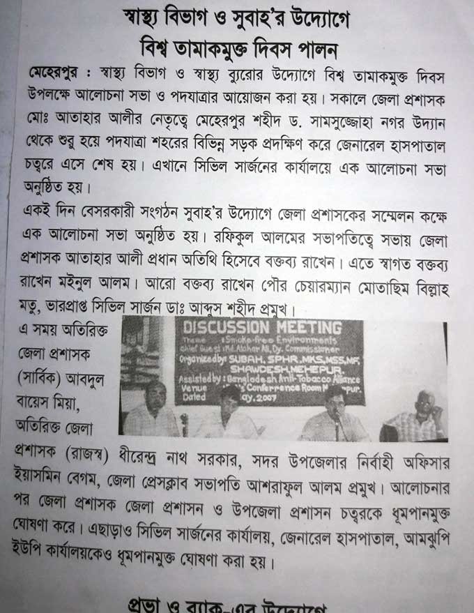 The Health Department and Health Bureau, in collaboration with Subah Samajik Unnayan Sangstha, jointly organized a discussion meeting and rally in Meherpur to mark World No Tobacco Day.