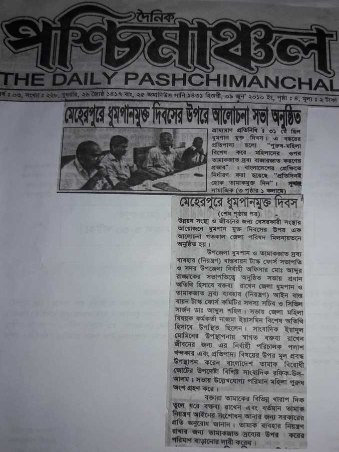 A discussion meeting was held in Meherpur to mark World No Tobacco Day, organized by Subah Samajik Unnayan Sangstha and the Department of Health, with the support of the District Administration. The event aimed to raise awareness about the harmful effects of tobacco and promote a tobacco-free society for better public health.